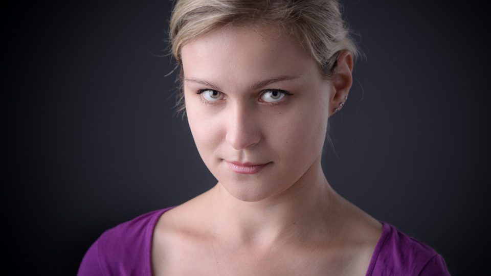 Pro fotku v úvodu (nad příspěvkem) jsem černý V-flat nahradil bílým odrazným a přidal druhé světlo. Velký box vlevo a lehce vpředu a menší box (odrazný deštník ve verzi Softlighter) vpravo vzadu, odkud osvětloval její levou stranu a odděloval od pozadí. Jemný dotek světla na její levé tváři je od světla z boxu, odraženého zpět. Možná se budete ptát, proč oba boxy nemíří přímo na ni, ale kousek mimo. Ze zkušenosti vím, že zhruba někde uprostřed světelného zdroje je světlo nejsilnější a směrem k okrajům jeho intenzita slábne. Raději než se samotným jádrem světla pracuji s jeho měkčím okrajem. Proto jádro boxu natáčím „kousek před“ nebo „kousek za“. Anglický výraz „feathering the light“ (feather=peří) to myslím vystihuje poměrně přesně. Jednak je na okraji světlo méně agresivní a jednak mám také prostor část světla odrazkou natvarovat a vrátit tam, kde by chybělo (na stinné straně tváře). Boxy pak umisťuji tak blízko, jak to jen z hlediska záběru jde. Jejich relativní velikost vzhledem k subjektu (a tím pádem měkkost světla) je tak největší možná a postačí menší výkon blesků.