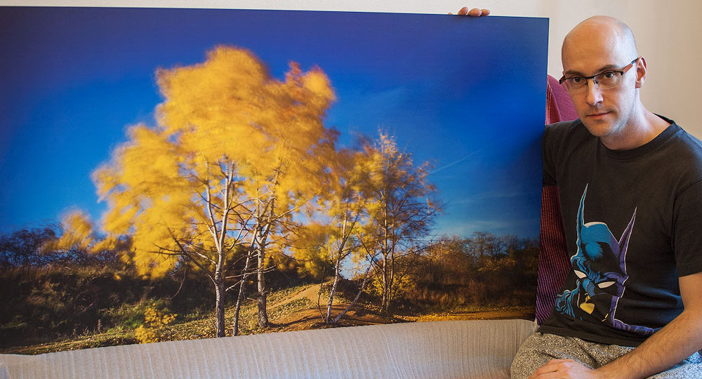 Výběr padl na břízy ve větru. Po zvážení klimatických podmínek v chatičce (0-30 °C a kolísající vlhkost) jsem zavrhl papír i plátno a zvolil hliníkovou desku. 90×60 bylo ok. Jenže kdesi vzadu v hlavě mě šimrala zvědavost. Co takhle trochu prozkoumat možnosti a rezervy mé 8 let staré D7000? Pojďme do toho. Největší co mají ve formátu 3:2 – 120×80. Za tři pracovní dny přišla zpráva o expedici. Když jsem o další dva dny později přijel do trafiky, kde si hotové zakázky normálně vyzvedávám, nikde jsem žádný větší placatý balík neviděl. Že by tady ještě nebyl? To je divný.