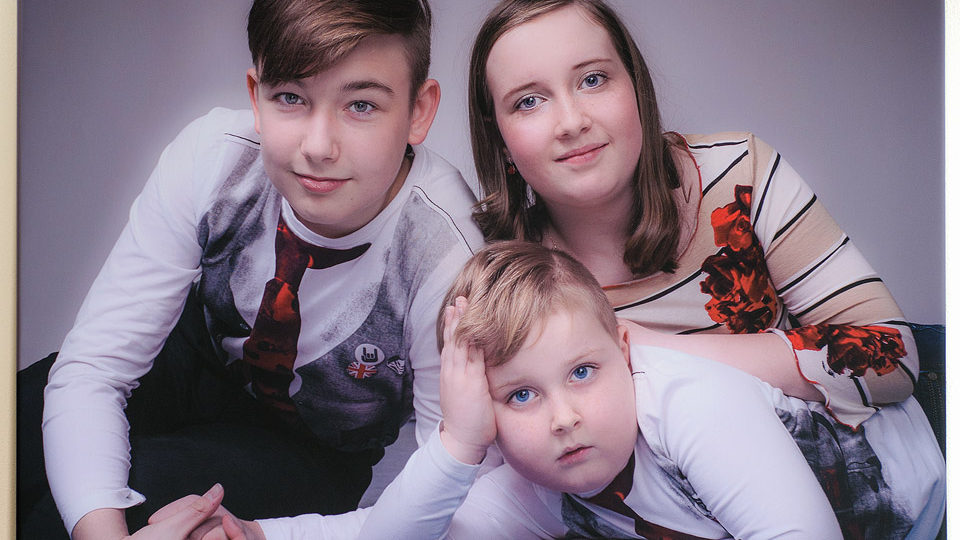 Dopředu mám na papírku vypsané nějaké nápady (nikdy nepodceňujte přípravu!) a focení odsýpá poměrně rychle. Žádné z dětí nenechávám dlouho zahálet a snažím se jejich pozornost udržet „na place“. Odměňují mě příkladnou spoluprací. Ani ten nejmenší přede mnou neutekl, a to považuji za úspěch. Někde v průběhu vzniká fotka na plátno (úvodní). Po hodině mi dochází nápady (i ty z papírku), a tak dávám „padla“. Ale ne, přece jen jsem na něco zapomněl. Kompozit z profilů. Ještě je prosím o posledních 5 minut. Z kufru tahám teleobjektiv 70-200 mm, čtyřiadvacetipalcový softbox Lastolite Ezybox. Do prostoru dávám jedinou židli, na které se postupně vystřídají všichni tři. Světlo na deseti hodinách vzhledem k židli. Potřebuji, aby světlo vykreslilo profil, dopadlo na hranu tváře a pak náhle zmizelo – aby stín vytvořil dostatečně kontrastní prostor pro další profil. Doma ve Photoshopu potom poskládám finální obrázek: