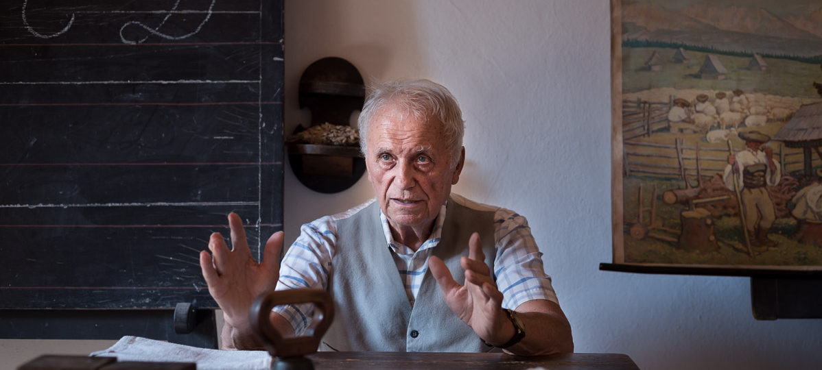 Na letošní dovolené jsme opět (už asi po páté či po šesté) zavítali do Valašského muzea v přírodě v Rožnově pod Radhoštěm. Už jsme tu viděli víceméně všechno. Ale otevřenou školu a v ní učitele teprve poprvé. Kouzelný stařík. Distinguovaný pán, který i přes svůj pokročilý věk vyzařoval duševní svěžest a moudrý životní nadhled na všechny strany. Poutavě a nikoli nesouvisle vyprávěl o realitě věku minulého, jakoby ji sám zažil, přestože nemohl. Vůbec se mi nechtělo pryč, dokázal bych poslouchat hodiny. Tak jsem se zeptal (to považuji za základní slušnost), zda si můžu udělat obrázek. Velkoryse svolil.