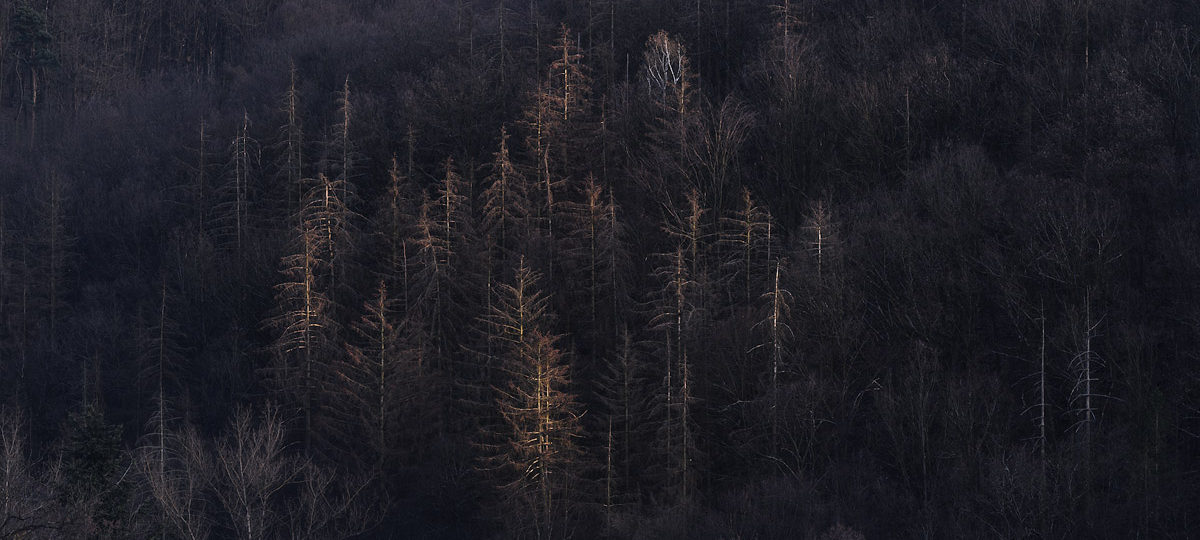 Nedávno cestou z garáže, to ještě nebyly listy na stromech, jsem si všiml, že poslední paprsky zapadajícího slunka jen tak letmo olizují kraj lesa. Den na to jsem se tam vrátil ve stejnou dobu, kouknul hledáčkem a byl téměř nadšen. Téměř. Dokonalou kompozici kazila jen osvětlená bříza v levém dolním rohu. Jak to jen udělat, aby na ni nesvítilo? Když dost dlouho počkám, napadlo mě, nebude svítit nikam. Roztáhl jsem stativ, pevně utáhl, našteloval expozici (tuším -1,7 EV, na pohled byl les dost tmavý) a sem tam zmáčknul. Celkem jsem tam stál asi 25 minut, ale měl obě fotky – tu osvětlenou i tu bez světla. Ve Photoshopu jsem pak obě fotky prolnul a světlo na bříze bylo v mžiku to tam.