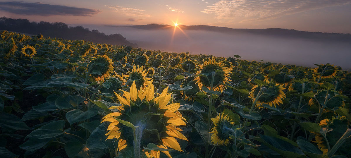 To, co dnes hledám, je anomálie. Slunečnice, která ráno NENÍ otočená na východ. Rebelka, která dokáže popřít svoji přirozenost. A – východ slunce. Nejlépe obojí v jedné fotce. Pár takových slunečnic jsem našel. Koukají na jih (na rozdíl od zbytku stáda, které tupě zírá na východ a čeká na nevyhnutelné).