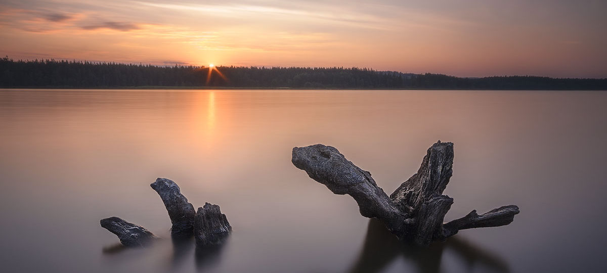 Budíček ve 4:30. Adrenalinová jízda kolmo potmě lesem s baterkou na hrudní přezce batohu. Můj bajk totiž žádné svítilny nemá (jsou pro trapáky a je to zbytečná zátěž). Naštěstí se nikdo nepokoušel Pomáhat a chránit. Hodinu do půli stehen ve vodě a hledání nejlepší kompozice a světla. ND filtr a kabelová spoušť zastrčené v plavkách, střídavě dle potřeby vytahuji jedno nebo druhé a to zbývající se snažím neutopit ve vodě. Série odstupňovaných expozic (bracketing pro HDR) s různým časem, různou clonou (f/9 pro maximální ostrost popředí a horizontu, f/22 pro sluneční paprsky) a různou zaostřovací vzdáleností (focus stacking).